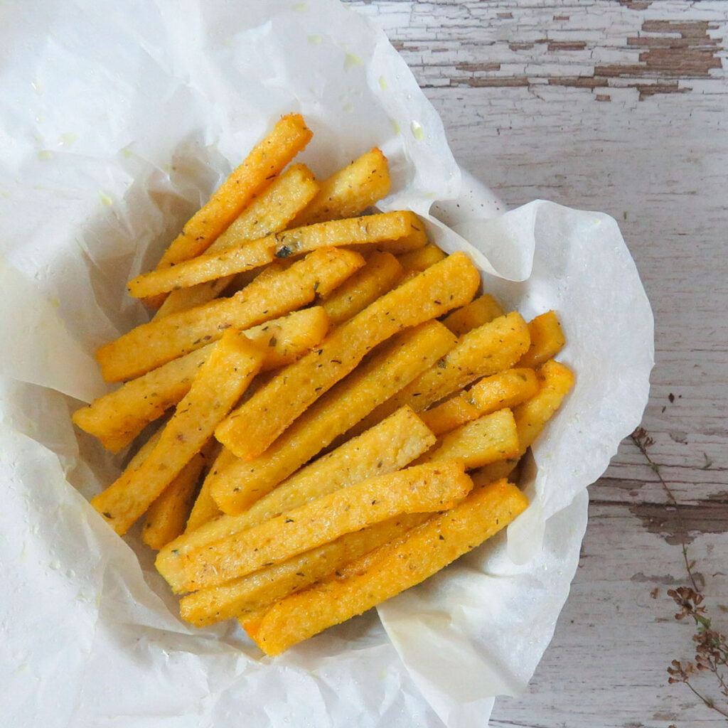 Crispy Polenta Fries (sticks) with a creamy vegan cashew garlic dip! This hearty snack recipe is gluten-free, vegan, easy to make & the perfect finger food!