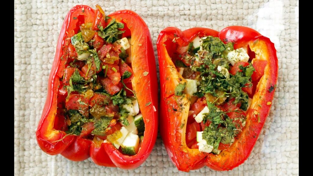 Vegan stuffed bell peppers recipe with healthy ingredients like rice, veggies, vegan cheese. The capsicum are gluten-free, easy to make, great for dinner!