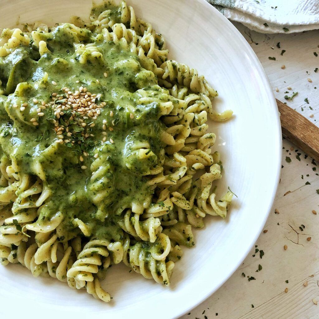 Vegan spinach pasta sauce. This creamy spinach basil sauce is done in 5 minutes and tastes amazing with spaghetti and other pasta. Plantbased + gf recipe
