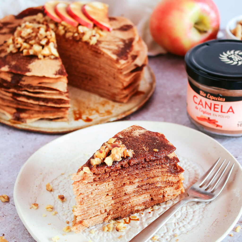 Apple cinnamon crepes with caramel sauce. This delicious fall recipe is a vegan (egg-free, dairy-free), gluten-free, easy, holiday dessert!
