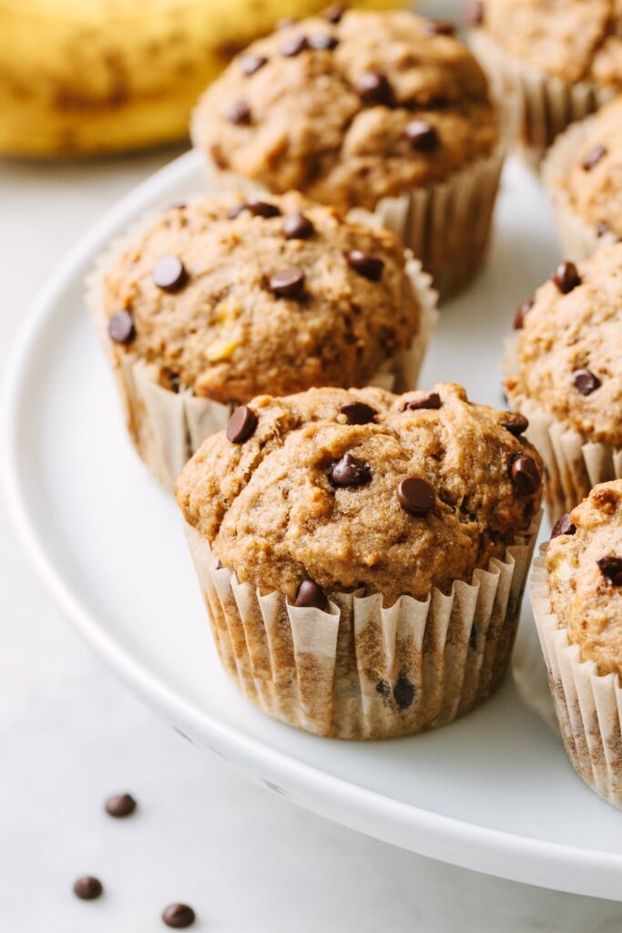 Moist banana chocolate chip muffins with simple ingredients. The recipe is vegan, gluten-free & easy to make. Great banana muffins for breakfast & dessert!