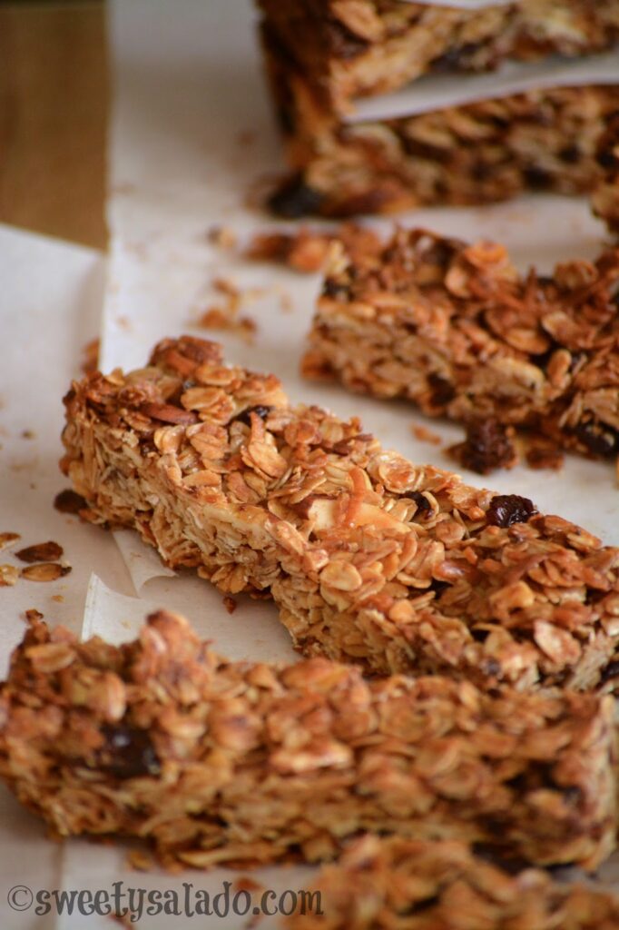 Chocolate granola bars which are great for breakfast or as a healthy snack. The recipe is vegan (dairy-free), gluten-free, refined sugar-free, and oil-free!