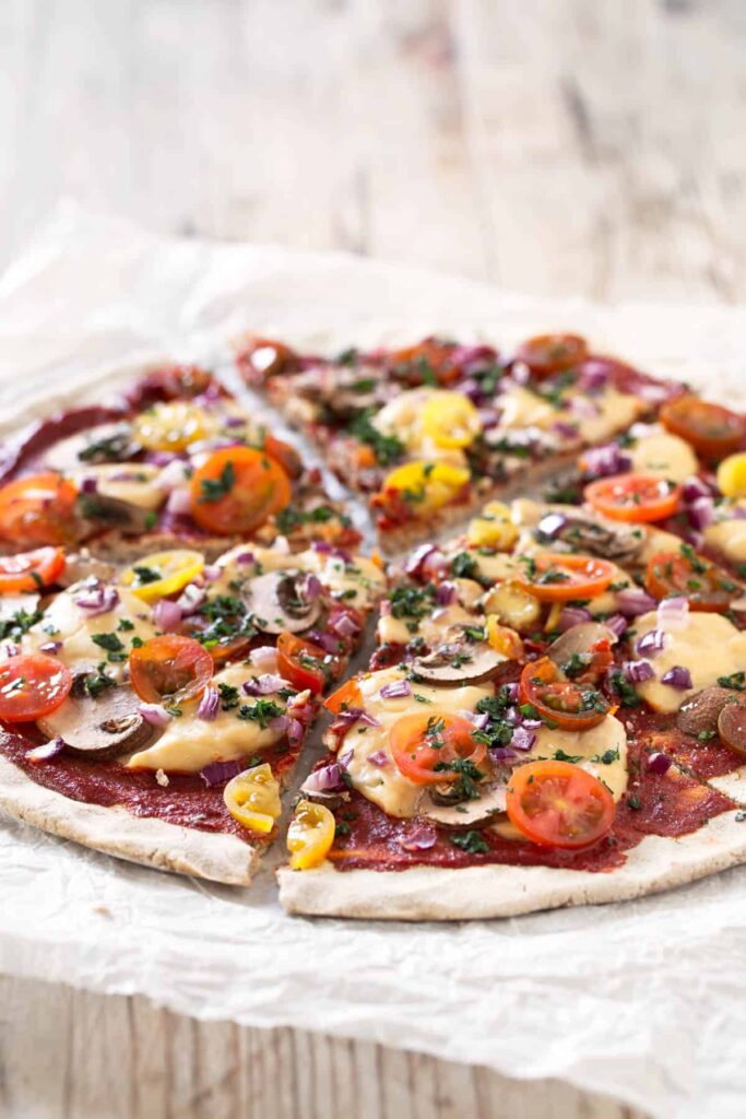 Vegan deep dish pizza recipe! This Chicago Style Pizza is not only plant-based but also gluten-free. Filled with healthy veggies, mushrooms & vegan cheese.