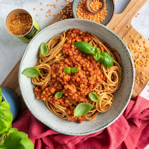 This Vegan Bolognese sauce with lentils is a hearty pasta dinner made with easy pantry ingredients. Perfect for vegans, vegetarians and meat-eaters alike!