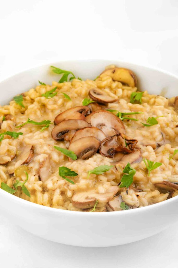 Vegan mushroom risotto.This dairy-free rice dish contains healthy plant-based protein from chickpeas. It's a flavorful easy to make weeknight dinner recipe.